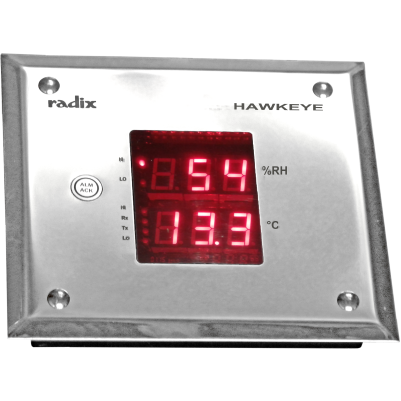Radix HAWKEYE RTC 2-Row Clean Room Monitor is a robust display device designed to show two critical environmental parameters such as Temperature, Humidity, Differential Pressure, or Air Velocity. It features a high-brightness dual-row LED display for clear and simultaneous parameter visibility. Powered by a 32-bit microprocessor, HAWKEYE offers precise readings, quick response, and 21-day onboard data logging (optional) for audit compliance. The sleek SS304 or aluminum flush-mount design is ideal for sterile and GMP-compliant environments. Communication options include RS-485 (Modbus RTU) or Ethernet, ensuring easy integration with BMS or SCADA systems.