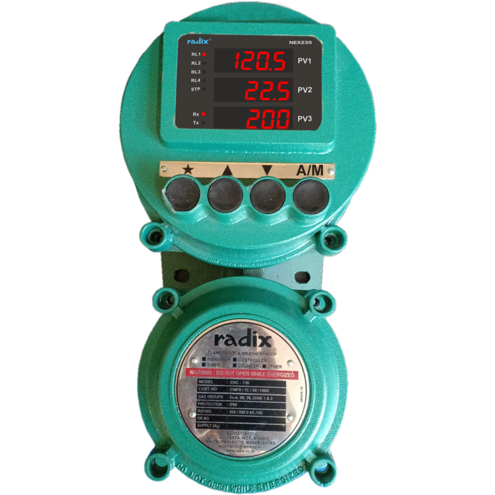 The communication in the process controller NEX235 available is Modbus® RTU connectivity with Isolated RS485 and the user programmable baud rate comprises from 2400 to 57600. Bumpless Auto/Manual control is provided. NEX235 has a supply voltage of 85-265 VAC with frequency 50/60 Hz or 18~30 VDC. The Enclosure is certified flameproof for gas groups IIA & IIB with material aluminium alloy.