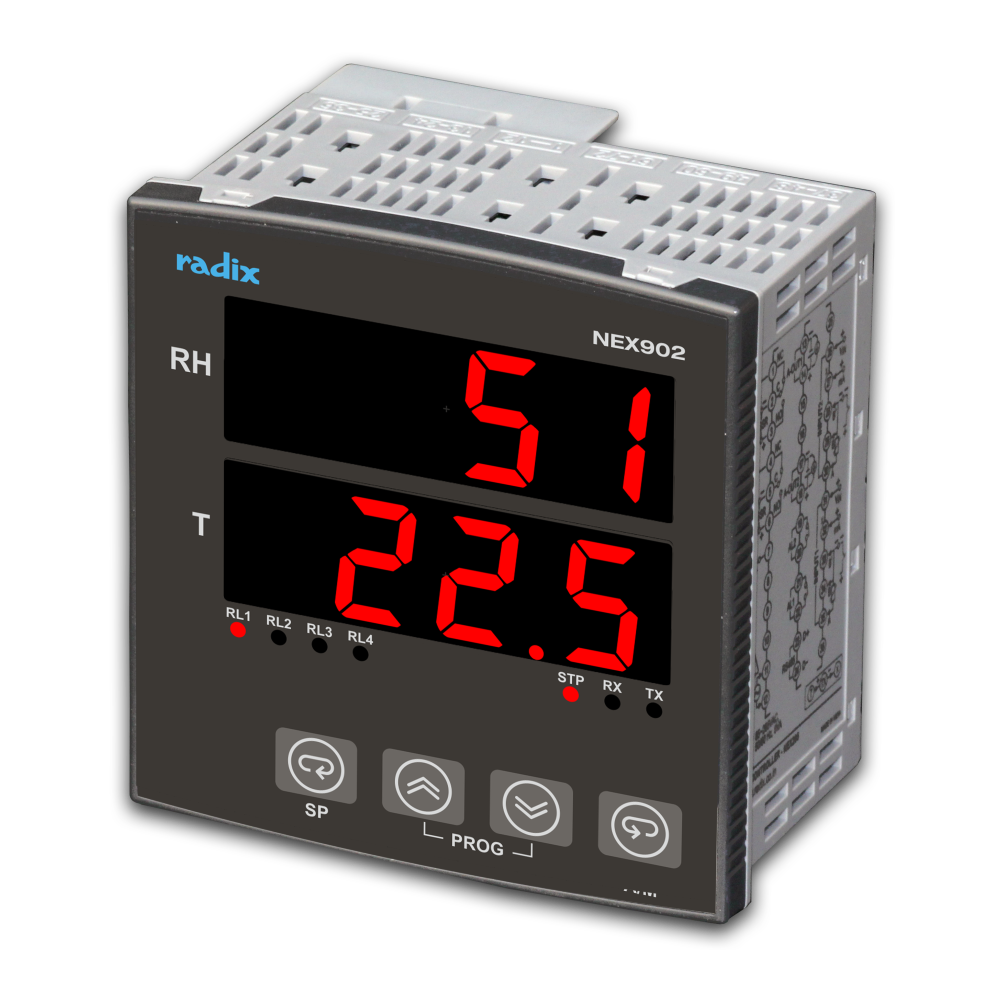%RH & TEMPERATURE ONOFF CONTROLLER NEX902.The Radix NEX902 is a high-performance %RH and temperature ON/OFF controller designed for precise humidity and temperature monitoring in industrial environments. Featuring dual analog outputs, four programmable relays, and RS485 communication with MODBUS RTU protocol, this compact controller ensures seamless integration and real-time control for HVAC systems, cleanrooms, greenhouses, pharmaceutical setups, and more. With support for wall and duct-mounted sensors (HTS201, HTS301, HTS401), the NEX902 delivers high accuracy (±2% RH, ±0.5°C) and fast response times. It includes a bright dual 4-digit LED display, multiple alarm configurations, and flexible power input options (20–42V DC or 85–265V AC). Engineered with IP65/IP66 front panel protection and housed in durable ABS plastic, the Radix NEX902 ensures long-lasting performance even in harsh industrial conditions. Whether you need standalone control or advanced data communication, the NEX902 offers a reliable, feature-rich solution for comprehensive environmental control.