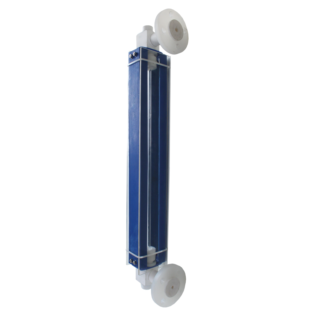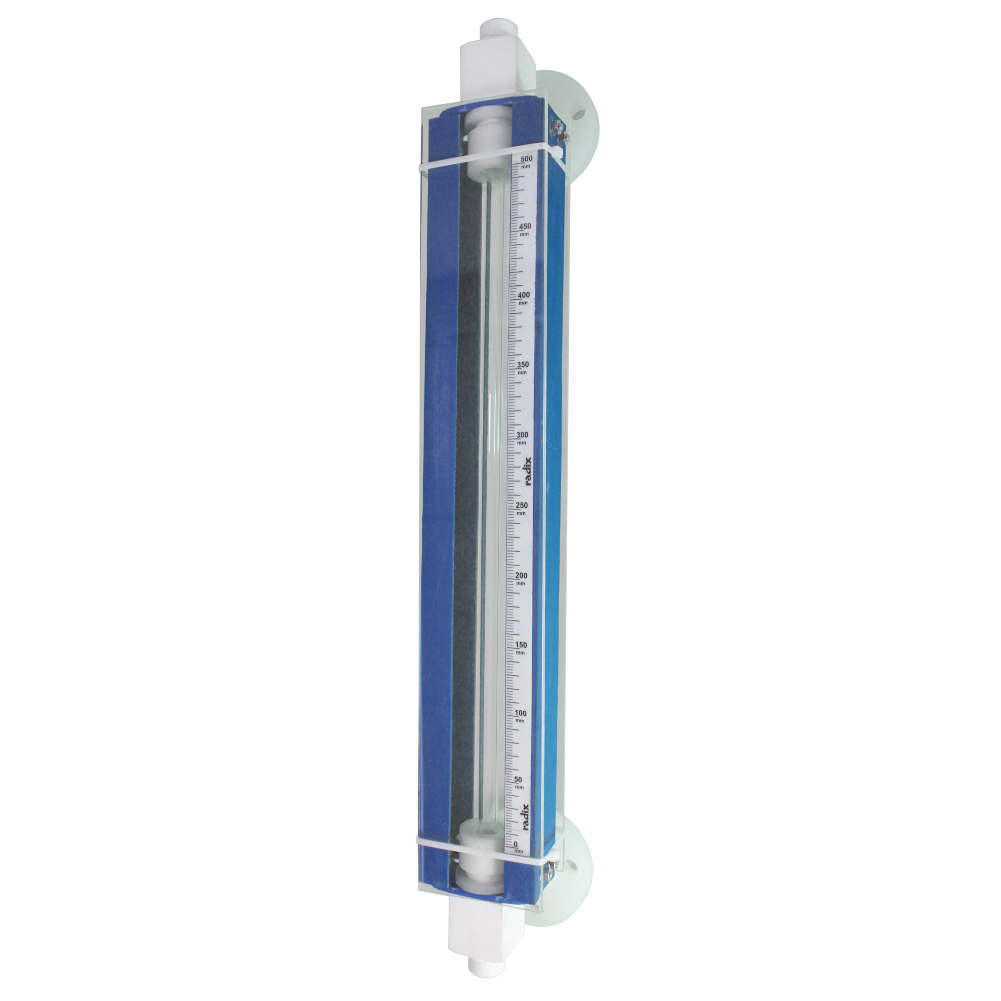 The level of liquid inside the glass tube is the same as the liquid level in the tank. Scale mounted on C- Frame indicates liquid level.